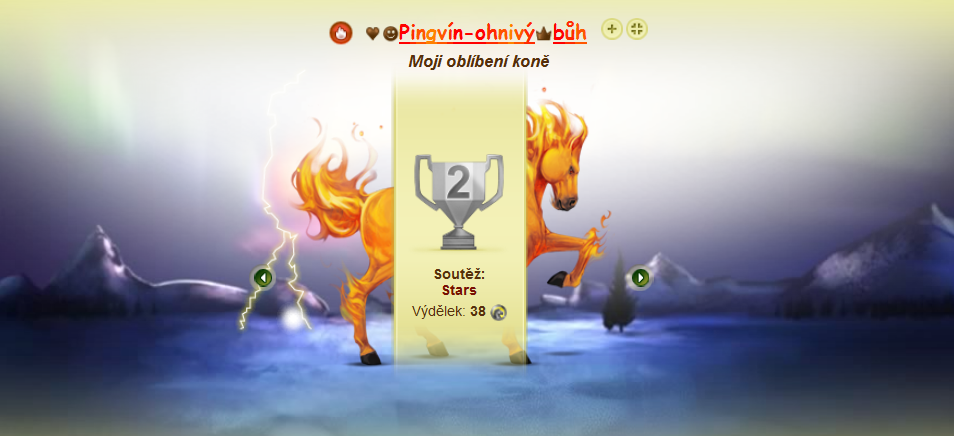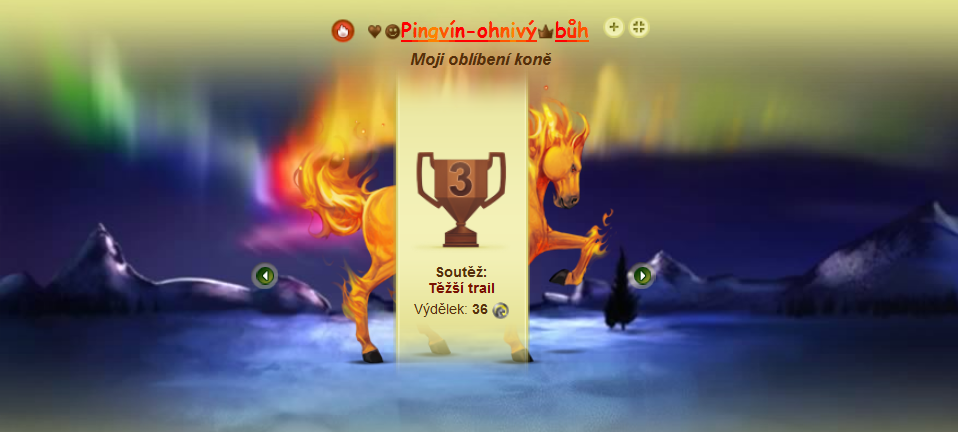 Když váš kůň něco vyhraje, zobrazí se na jeho stránce, že vyhrál to a to místo. No jo, ale howrse nyní zavedlo skvělou věc! Sami se koukněte, co se mi zobrazilo na stránce mého koníka jménem Pingvín-ohnivý bůh: